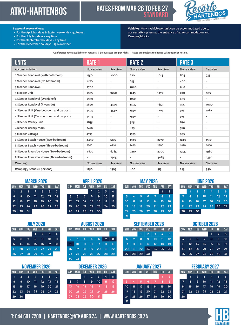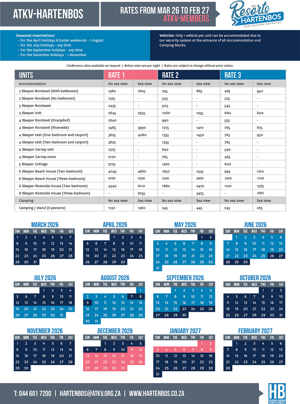 To check the availability of accommodation and to make bookings, contact the resort directly.